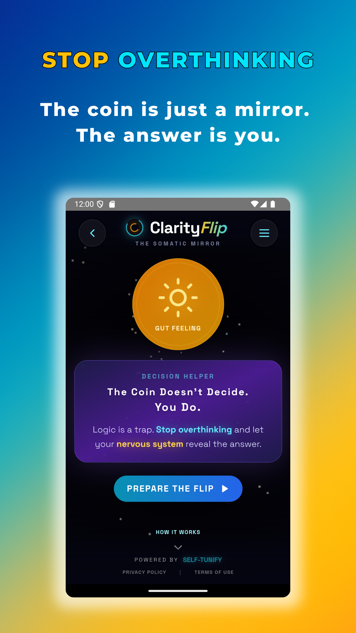 Most people flip a coin to let fate decide. ClarityFlip uses the coin to reveal what you actually want. Reclaim your intuition today.